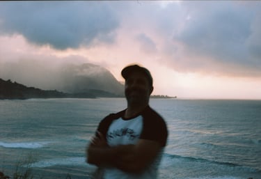 I like photography and have surfed in 14 countries. My girlfriend is smart and hot. I made an unhinged Holiday Card with Flow AI from Google Labs. It's amateur hour when I hold a 35mm film camera, but it's MY amateur hour: